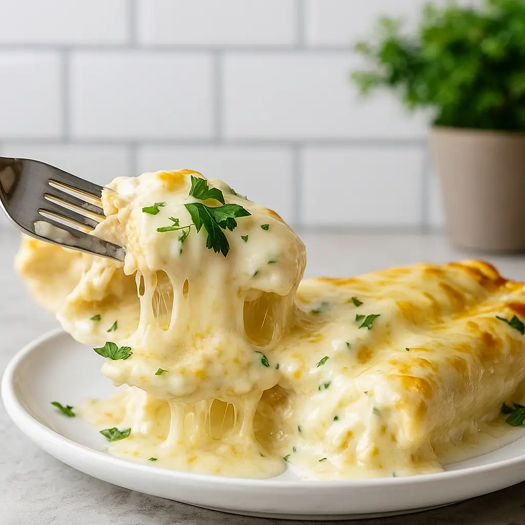 - Comfort food at its finest – gooey cheese, soft tortillas, and a tangy, creamy white sauce.
